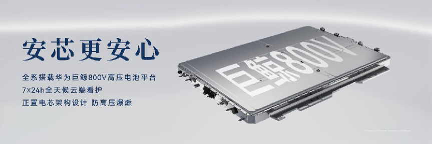 电池安全作为电动车的重中之重,新车全系标配华为巨鲸 800V 高压电池平台,采用创新的正置电芯架构设计,能有效防止高压爆燃,从结构上规避了电池安全的核心风险。同时,电池系统配备 7x24h 全天候 BMS 云端看护,实时监测电池状态,提前预警安全隐患,让电池安全得到全时段、全方位的保障,让用户的电动出行安心无忧。