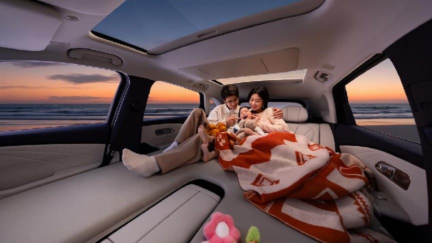 在空间实用性上,该车提供同级唯一的前后排双大床模式,一二排成床尺寸达 1825×1315mm,后排放平后可形成 2203mm×1210mm 的纯平大空间,后备箱容积可从 573L 拓展至 1597L,搭配 50L 下沉式储物空间和 38 处车内储物格,轻松满足家庭露营、长途出行等全场景装载需求。同时,前排双零重力悠然座椅配备 16 向电动调节、3 档通风加热和 10 点按摩功能,二排座椅支持 115°-125° 电动调节及通风加热,配合 23 扬伯牙之音全景声音响、前后排双 IMAX 星空影院和 - 6° 至 50° 可拓展生态冰箱,将座舱打造成集舒适、娱乐、休闲于一体的 “移动第三空间”。