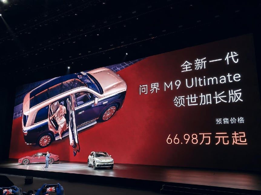 全新一代问界 M9 系列预售价格为49.98 万元起,全新一代问界 M9 Ultimate 领世加长版预售价格为66.98 万元起。即日起至大定开启日,支付 5000 元意向金可抵扣 10000 元购车尾款。