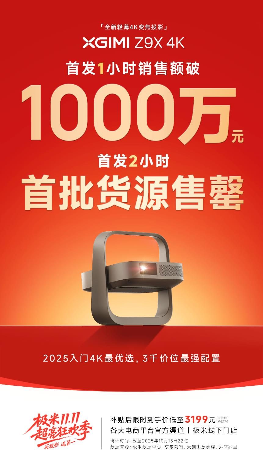 10月15日晚八点,全新轻薄4K变焦投影极米 Z9X 4K 全平台现货开售,销售势头强劲,一经上线便迅速获得市场认可。首发一小时全渠道销售额破1000万元,首发两小时,首批货源全部售罄,再次印证了极米作为全球家用投影品牌TOP1的市场认可度!