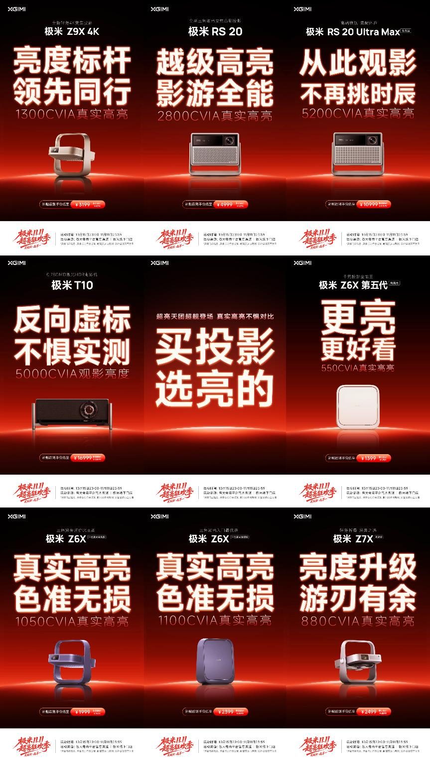 「极米11.11超亮狂欢季」现全网火热开启!多款“超亮天团”重磅新品,亮度全面升级,福利“补上加补”,开启价格抄底风暴!从千元入门到旗舰顶配,全面覆盖各价位段,满足不同用户的多元需求。欢迎前往极米官网、各大电商平台官方旗舰店、直播间或极米全国线下门店选购体验。买投影,就选亮的!
