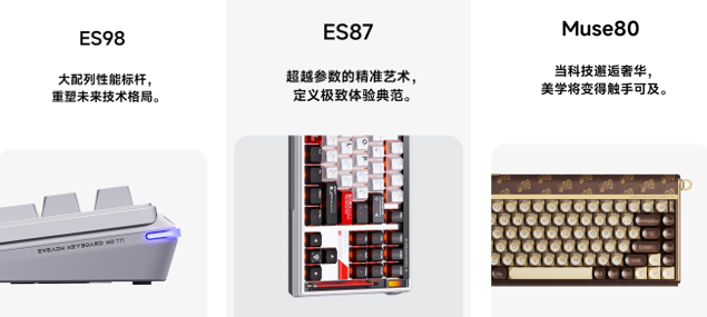 技术创新层面,ES98凭借双8K回报率与0.05ms延迟铸就竞技旗舰,ES87以星闪磁轴的顶尖精度与首创翻盖快拆设计革新体验,Muse80融合奢侈品牌剪裁灵感,用皮革+CNC全铝工艺彰显奢华品位。