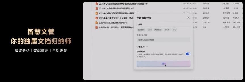 小艺知识库则作为“个人知识管家”,支持文字、图片、音视频等全品类内容收藏,智能分类功能实现零配置自动归档,关键词与标签双维检索让海量资料“秒搜即达”,结合AI问答与Word/PDF导出功能,让知识管理从“被动存储”升级为“主动赋能”。智慧文管的智能分类功能,支持用户按关键词、类型等条件设定规则,系统自动聚合分散文件生成虚拟视图,实现从“人找文件”到“文件找人”的转变;还可以利用本地大模型,在保障安全的同时自动生成文档摘要,50页的PDF文档无需逐字阅读就能快速掌握重点,真正实现效率飞跃。