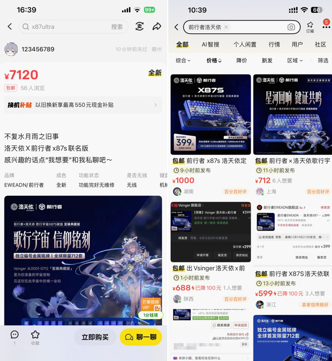 闲鱼平台上,关于前行者×洛天依联名键盘的讨论仍在继续。一些未能抢到首发的用户仍在寻找转让机会,而幸运的拥有者则在分享开箱体验。