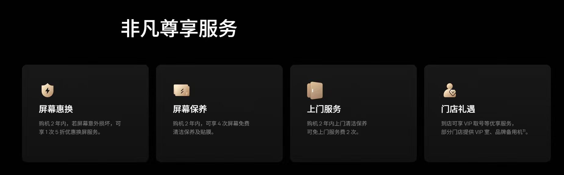 最后再告诉大家一个好消息:购买HUAWEI MateBook Fold,享非凡尊享服务。购机2年内,屏幕意外损坏可享1次优惠换屏服务;2年内免费享4次屏幕贴膜及保养服务。随新机加购HUAWEI Care+后:HUAWEI MateBook Pro可享2次意外保障、3年官方质保、当电池最大容量低于80%可免费更换电池;HUAWEI MateBook Fold 非凡大师可享2年1次屏幕保障服务,一步到位,呵护有加!全方位呵护设备使用全程。