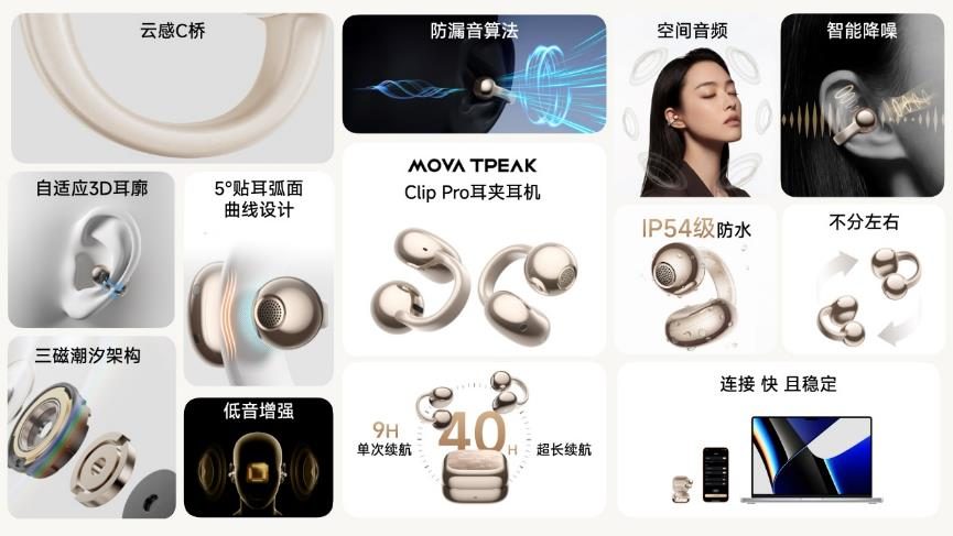从立项到发布,MOVA TPEAK仅用七个月时间,将这款耳夹耳机打磨至市场头部水准,在音质、舒适、科技与设计之间实现平衡。MOVA TPEAK Clip Pro 面向追求音质与佩戴舒适并重的音乐爱好者,关注前沿科技的数码先锋、注重形象与效率的商务人士,以及将耳机视为日常穿搭一部分的潮流人群,为“全天候佩戴者”提供了一种真正轻松、无负担的选择。