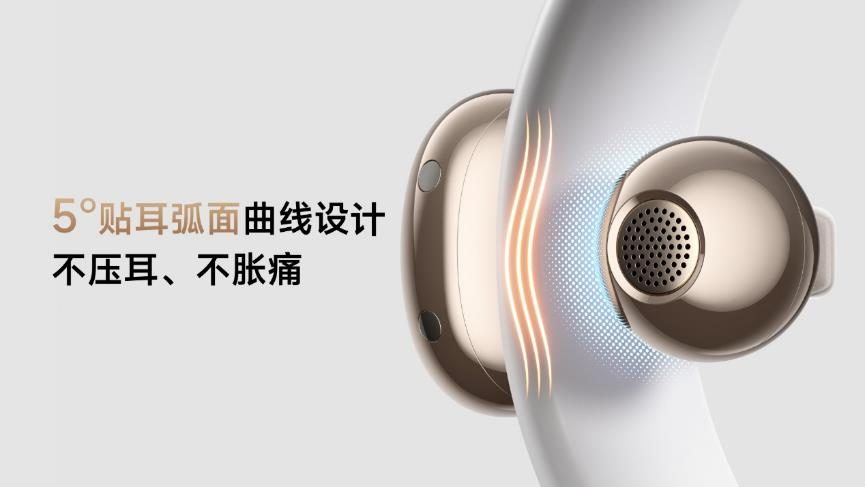 其前侧悦听球经过多轮位置微调,贴合在最有利于传声、也最不易偏移的位置;后侧能源仓采用 5° 贴耳弧面曲线设计,顺应耳后自然轮廓,一贴即稳。整体结构将传统“夹力”转化为均匀、柔和的包裹力,如同气流贴合耳廓,实现真正的“零压力承托”。