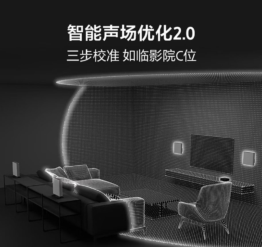 在核心音频技术上,HT-A9M2 搭载了全面升级的 360 智能穹顶声场 2.0 技术。通过先进的智能算法,系统可生成多个 “幻象扬声器”,彻底打破了传统扬声器的物理摆位局限,在房间内构建出广阔的环绕声场,让用户在房间内的绝大多数位置,都能体验到参考级的环绕声效果,实现了真正的全域沉浸聆听。同时,升级后的智能声场优化 2.0 功能,可自动侦测房间布局、扬声器位置,分析空间声学特性,仅需三步即可完成精准声场校准,无需专业人员调试,普通用户就能在家中获得影院 C 位级的音效体验,大幅降低了高端家庭影院的使用门槛。