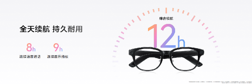 充电和续航数据来源于华为实验室,受电池特性影响,环境温度过高或过低,充电速度亦会变慢,请以实际使用为准。在环境温度 25°C 下,使用眼镜充电绳并配合 5V 1A 及以上的正规充电器为眼镜从 0% 充电 10 分钟后,在室内光源,50% 音量,所有功能处于出厂默认设置状态,可听歌 3 小时或拍照 200 张。实际使用中可能因产品个体差异、使用习惯和环境因素不同略有不同,续航体验请以实际使用情况为准。
