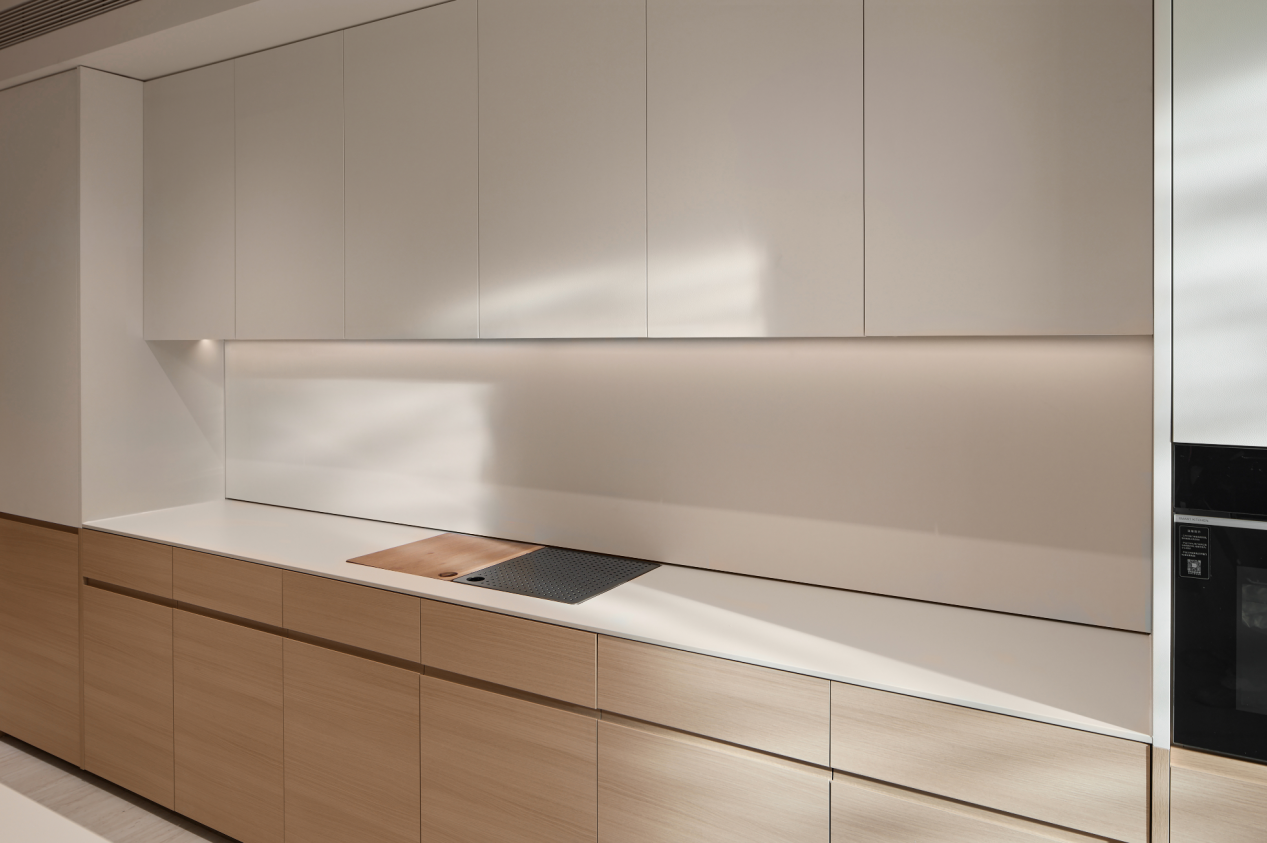 栖息地 S32 的高功能密度,在厨房空间体现得淋漓尽致。针对传统厨房空间利用率低、功能零散的问题, 栖息地 S32 将整面墙进行一体化收纳设计,隐藏门设计呈现无缝留白,充分发挥立面的功能潜力;配合一体化烟机灶具、隐藏式电动升降中部柜、集成式水槽柜、卫生间砖缝空间功能扩充等功能模块化产品设计,栖息地 S32 在单位空间内实现了功能的翻倍,将空间的效能发挥到极致,让下厨成为一种享受,让温馨的人间烟火,成为新生活的日常。