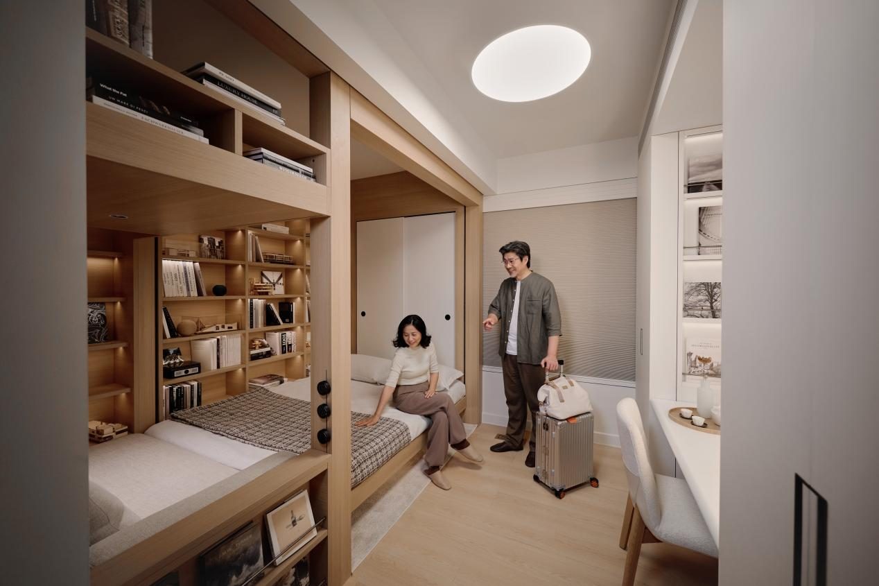 更具突破性的是栖息地 S32 对空间复用和时间维度的思考。「Y空间」解决了三代同堂的空间取舍难题, 在三室两卫的常规户型中,通过集成不同的空间功能,配合升降床、二层空间等产品模块设计,让一个空间兼顾书房与次卧功能,有效提升空间复用,实现「三居室拥有四居室的居住能力」;「X空间」则围绕家庭生活的时间维度打造,尤其贴合女性用户的需求,让同一空间在不同生活阶段绽放不同价值,根据从无孩阶段到有孩阶段不同时期的生活方式,同一空间可从衣帽间、美妆区可灵活切换为母婴房、独处休闲区,在时间维度实现功能弹性。