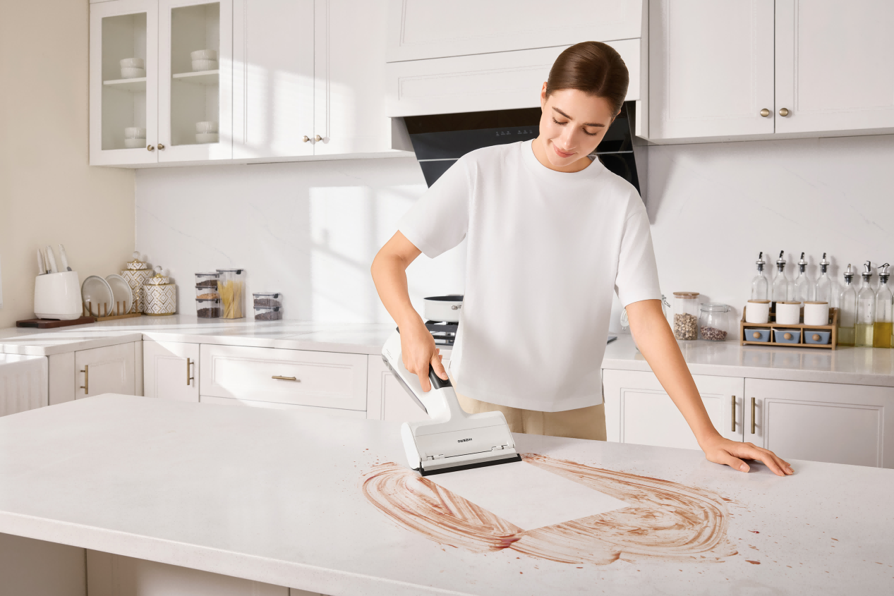 作为传统抹布的颠覆者,H100R 电子抹布机则填补了台面、立面清洁的市场空白,这也是全球首款将自清洁滚筒应用于硬质表面立面清洁的产品。其独创的电子抹布形态,搭配高分子柔性清洁滚筒,可轻松应对玻璃、镜面、瓷砖、厨房台面等各类硬质表面,一推一拉即可完成清洁、刮干、自清洁全流程,实现干湿垃圾同步收集与自动分离,从根源上终结了抹布 “越擦越脏” 的问题,不脏手、无水痕、避免二次污染的优势,既适配对家居清洁度有高要求的家庭,也成为餐厅、酒店、办公室等商业场所保洁的高效工具。