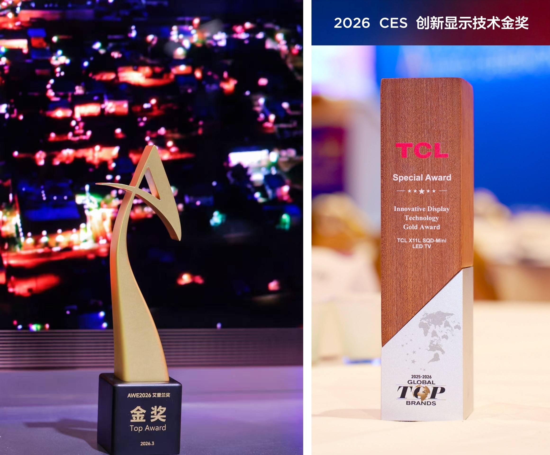 这一技术实力也得到了专业领域的高度认可:中国视像协会认证SQD-Mini LED技术引领显示行业突破,颁发科技创新奖;CES 2026上,SQD-Mini LED斩获创新显示技术金奖,被众多科技媒体评选为“BEST OF 2026CES”;而AWE 2026,搭载SQD-Mini LED技术的TCL X11L电视更获得了艾普兰奖金奖,受到海内外媒体的高度评价。