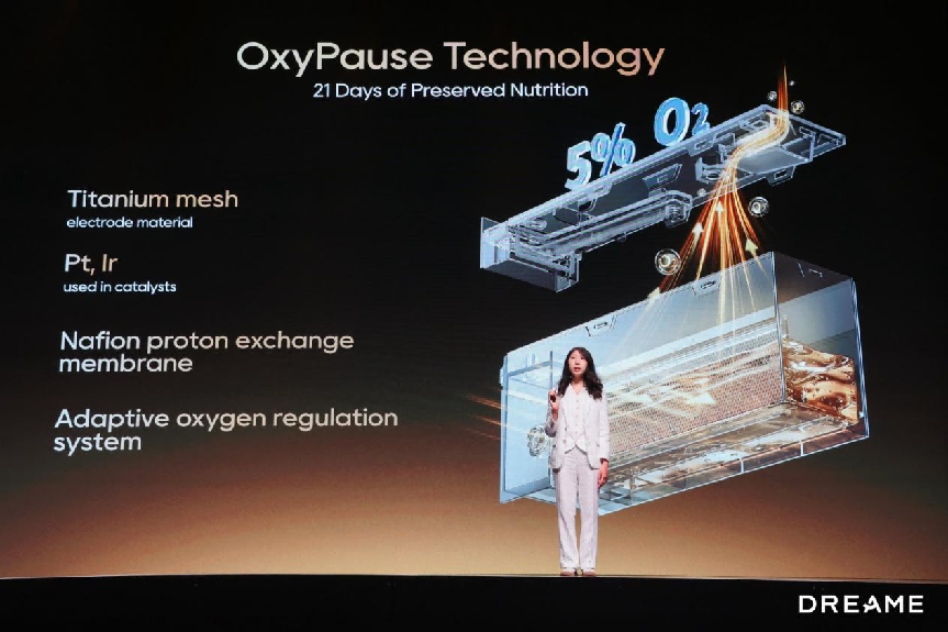 在保鲜这个核心赛道,追觅更是直接刷新了行业标准,发布第二代 5% 超低氧保鲜技术。当前行业主流的控氧保鲜技术,除氧后舱内氧气浓度普遍在 15%~19%,仅能实现基础的延缓腐败;而追觅通过贵金属电极材料、自适应压力密封技术、AI 智控系统的三重突破,将低氧舱内氧气浓度长期稳定控制在 5% 的黄金保鲜区间。