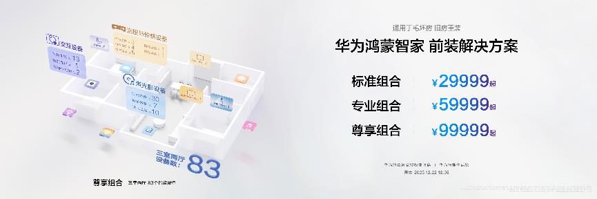 华为鸿蒙智家前装解决方案专为毛坯房、旧房重装需求人群订制,29999元起的标准组合,基于星闪TM[19]蓝牙多合一连接,满足灯光氛围便捷开关、智能窗帘控制、空调智能温控、居家安防等智能基础控制需求;59999元起的专业组合在此基础上针对无感灯光控制、影音娱乐再升级,显著提升氛围体验;99999元起的尊享组合则为用户提供主动健康空气、空间主题、家庭影院等更为丰富的智能家居解决方案,智慧生活一步到位。