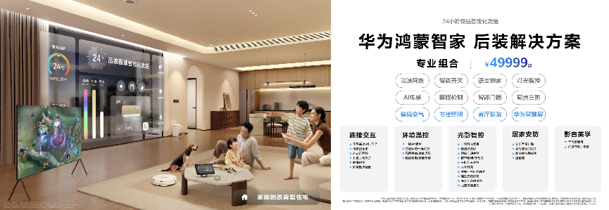 让主动智能体验走进千家万户,离不开丰富的产品矩阵与解决方案。鸿蒙智联生态汇聚合作品牌3200余家,覆盖品类400余种,丰富生态产品在华为智慧生活APP中可查可购,为消费者带来种类丰富、方便购买、物有所值的智能家居产品。针对旧房改造人群需求,华为鸿蒙智家推出了后装解决方案三档套餐,包括9999元尝鲜组合、25999元标准组合、49999元专业组合,覆盖全屋智能基础需求和进阶体验。同时提供智能温控组合、厨房安全组合、智能窗帘组合等局部入门套装,百元级价格即可实现局部改造,大幅降低体验门槛,让智能生活从一个场景轻松开启。