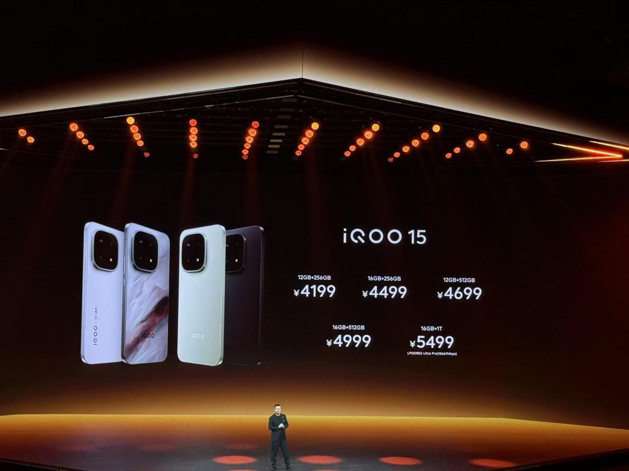 iQOO 15全渠道首销即同步登陆vivo官网、京东、天猫、拼多多等平台,12GB+256GB版本售价4199元,顶配16GB+1TB版本5499元,首销当日购机可享24期免息、以旧换新最高补贴1200元及限量《王者荣耀》皮肤。