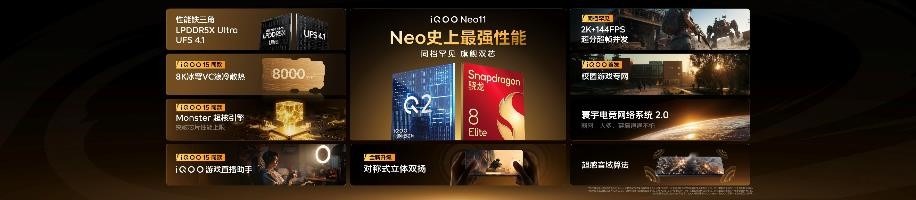 iQOO Neo11 搭载由骁龙 8 至尊版与自研电竞芯片 Q2 组成的“旗舰电竞双芯”,并在 Monster 超核引擎支撑下,带来优秀的 1% Low 帧表现、全新升级的 PC 级 2K 纹理超分、原生级 144FPS 无损超帧以及超分超帧并发,实现行业领先的游戏视效;更以 8K 冰穹 VC 液冷散热、7500mAh 超薄蓝海电池、AR 增透膜等多项 iQOO 15 同款配置、高质感金属玻璃机身和 IP68 & IP69 防尘防水等,共筑一款更优秀的强悍标准版。