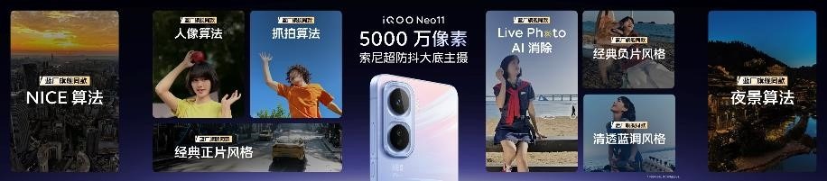 iQOO Neo11 配备后置 5000 万像素索尼超防抖大底主摄,并得到蓝厂旗舰同款 NICE 算法加持,同时影像玩法也有升级,全新的风格化光斑、负片、正片和清透蓝调等滤镜以及升级的 LivePhoto 动态照片、LivePhoto AI 消除和 AI 修图大师等,让出片更轻松。