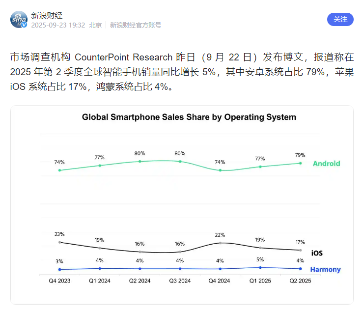 根据Counterpoint数据,鸿蒙系统在中国已连续六个季度超越iOS,稳居第二大操作系统,全球市场份额达4%。