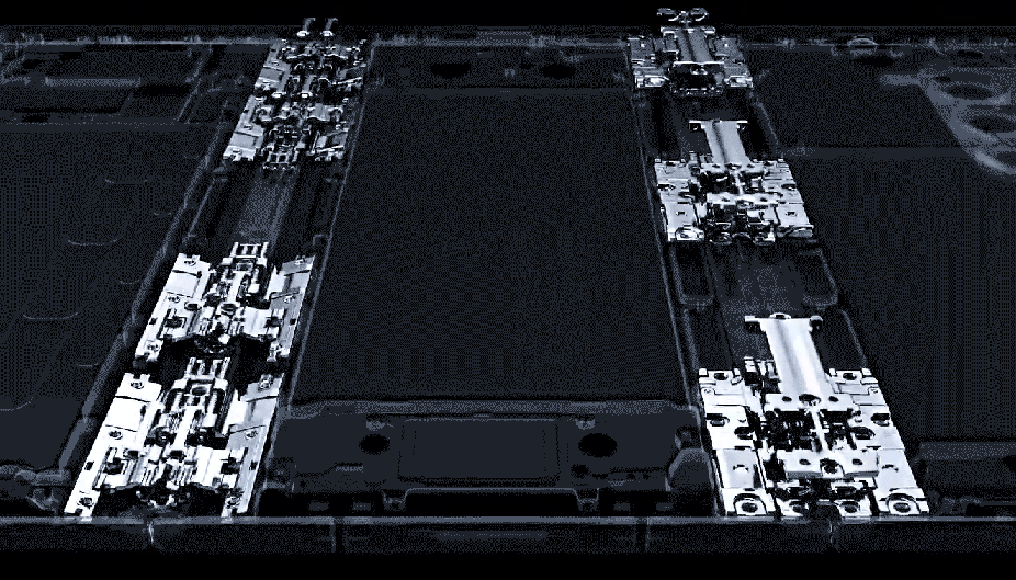 - 外部采用的先进材料:铰链盖采用钛金属材质,并利用超薄金属片有效保护内部可折叠结构,同时还兼具抗磨损特性。机身边框则由高强度的增强型装甲铝[9]打造,实现在不增加机身厚度的前提下强化了机身强度,并避免各屏幕面板彼此接触。机身背部采用陶瓷玻纤背板,在保持轻薄的同时可有效防止外力导致的开裂。