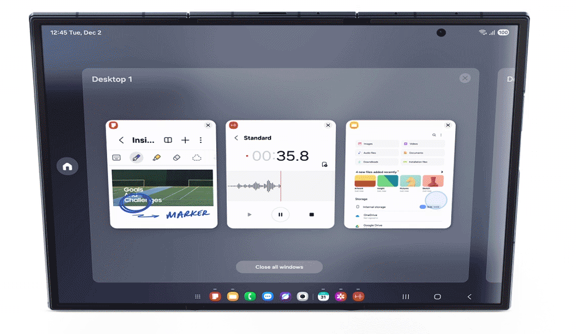 三星Galaxy Z TriFold还是首款可在机身本地运行Samsung DeX[10]的Galaxy手机,让用户可以轻松、快速地设置好办公环境,充分释放大屏的强大潜能。用户只需进入快捷设置面板并选择DeX,即可开启由Galaxy打造的高效工作模式。该模式至多支持四个独立的桌面,每个桌面可同时运行五个应用程序。用户可在其中一个桌面审阅、编辑会议的演示文稿, 随后快速切换至另一个桌面,与朋友聊天或浏览购物网站。为进一步提高办公效率,用户还可连接外部显示器,开启扩展模式打造双屏协同体验。在该模式下,应用程序窗口可在两个屏幕间随心拖放,实现如PC般的高效跨屏操作。三星Galaxy Z TriFold通过蓝牙连接鼠标与键盘后,便可成为便携工作站,帮助用户轻松应对复杂的项目或是创意设计方面的工作。