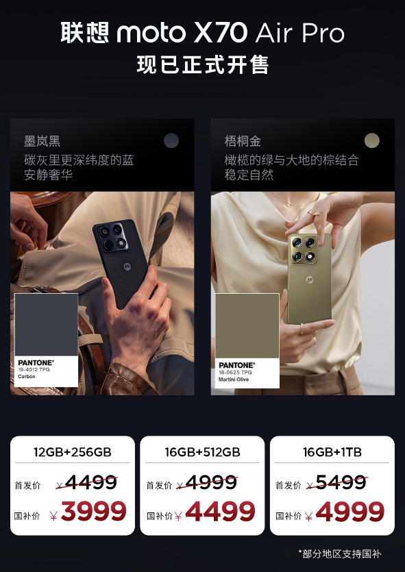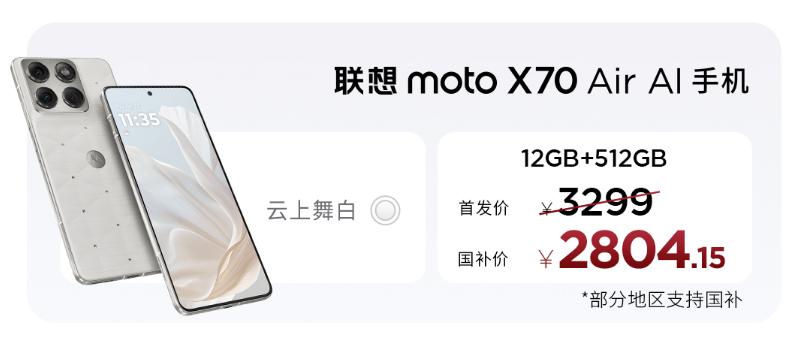 为让更多用户享受到科技红利,联想moto推出极具竞争力的价格与丰厚首销福利。联想moto X70 Air Pro AI手机官方定价4499元起,国补到手价仅3999元起,其中12GB+256GB版本国补后3999元,16GB+512GB版本4499元,16GB+1TB版本4999元;联想moto X70 Air云上舞白冰钻限定版(12GB+512GB)官方定价3499元,国补到手价约2804元。