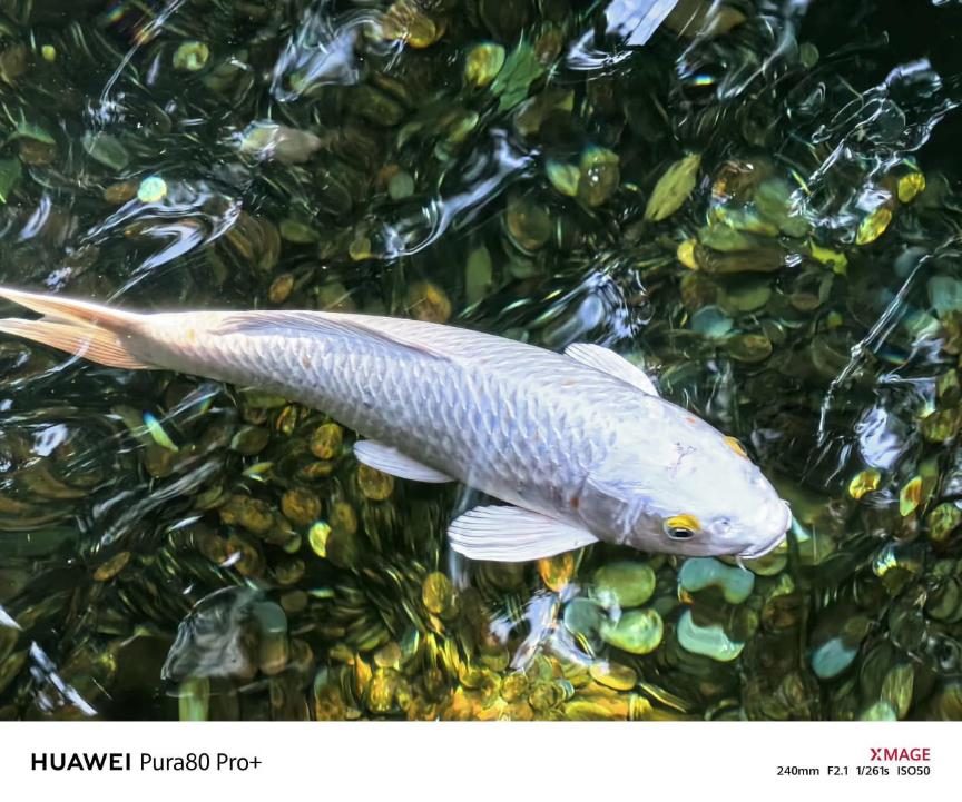 游动锦鲤样张中,1/261s快门速度精准定格动态瞬间,鱼鳞纹理锐利,水下石子色彩还原真实,水面反光控制出色,无炫光、鬼影干扰。