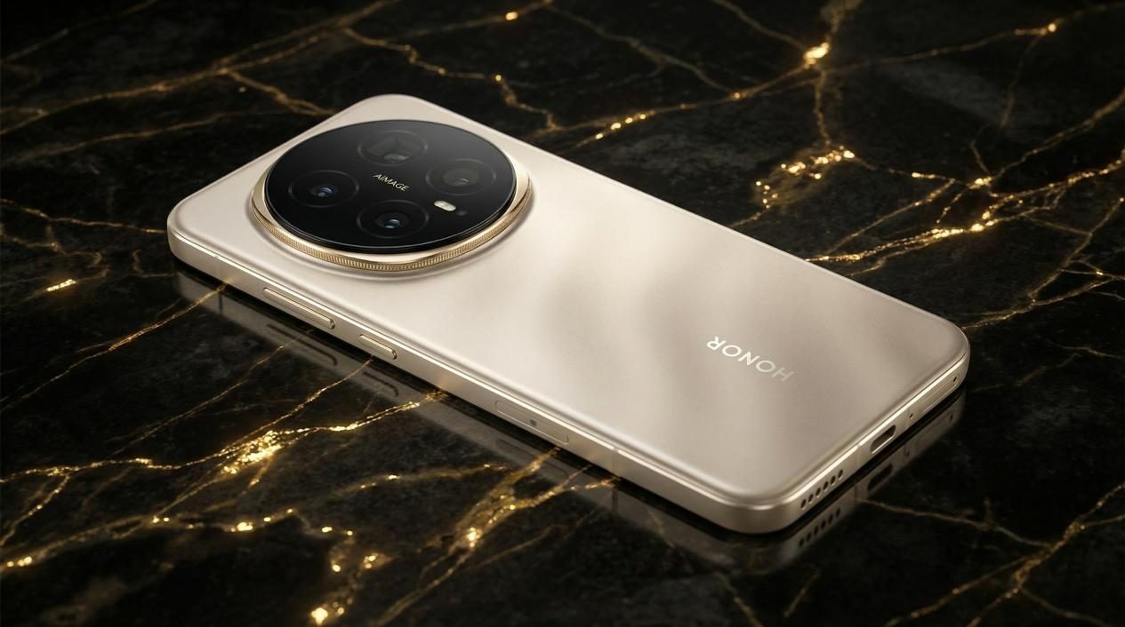 荣耀 Magic8 Pro 金色款的核心设计亮点,在于背板的缎面光影工艺。不同于市面上常见的纯色金、亮面金设计,该机采用了全新的 AG 磨砂缎面玻璃工艺,在低饱和度的暖金色基底上,融入了如丝绸流水般的光影纹理。