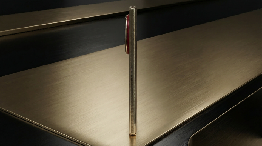 荣耀 Magic V6 赤兔红采用航空铝直边中框,经过精密的 CNC 加工与阳极氧化处理,呈现出温润的香槟金色泽。中框与前后盖的衔接处采用内外双 R 角对称设计,线条流畅自然,既保证了视觉上的统一性,又带来了舒适的握持手感。