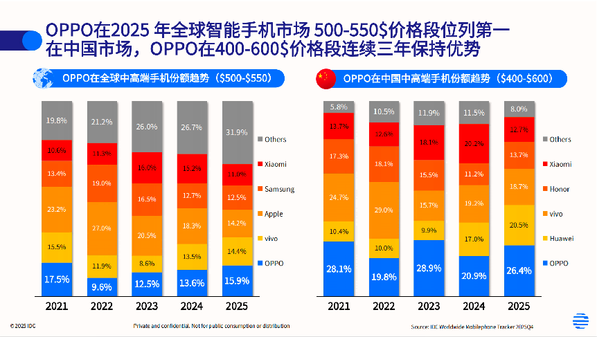 权威数据印证了 OPPO 高端化的成果:2025 年,OPPO 在全球500-550 美元价位段稳居第一,平均售价位列全球第三。更重要的是,OPPO 在海外市场的品牌形象已经完成了从 “性价比选择” 到 “高端可靠品牌” 的跃迁,越来越多的全球消费者开始将 OPPO 视为高端智能手机的首选品牌之一。