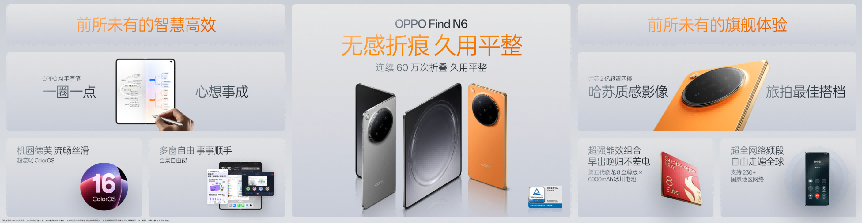 凭借极致的平整度表现,Find N6 被德国莱茵认证为“全球最平整的折叠手机”,同时也是全球首款通过 “连续 60 万次折叠久用平整” 认证的折叠旗舰,真正实现了 “无感折痕”。市场反响更是火爆,首销当日便创下京东、天猫双平台近一年全品牌、全形态折叠屏销售额纪录,全国多家线下门店瞬间售罄,用销量印证了技术的胜利。