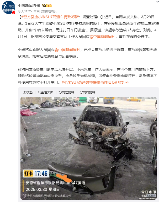小米SU7高速碰撞起火致三人死亡,官方紧急回应车门断电锁死质疑