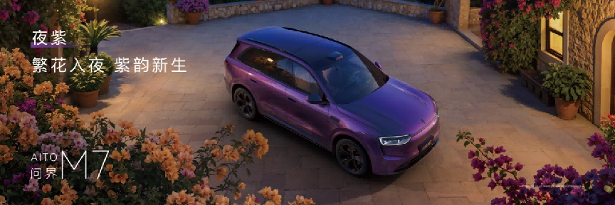 设计层面,问界 M7 新增 “夜紫” 专属车色,灵感源自 5000 光年外的银河星系,铝粉与红紫珠光漆的精妙配比,呈现出纯粹饱和的星空质感,为家庭出行注入宁静与优雅。同步推出的 21 英寸星芒轮毂选配,与夜紫车色相呼应,进一步提升车辆的豪华感与精致度,让家庭旗舰也拥有独具格调的视觉表达。