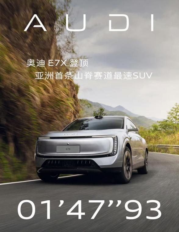 而真正让行业为之震撼的,是奥迪E7X在上市前就交出的一份硬核成绩单。2026年4月7日,在被誉为“中国版纽博格林”的浙江新昌佰骏山地赛道,奥迪E7X以1分47秒93的惊人圈速,一举登顶亚洲首条山脊竞速赛道SUV圈速榜,成为该赛道“最速SUV”。