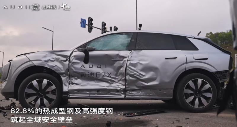 在最近TOP Safety举办的“多工况连续随机碰撞挑战”中,奥迪E7X交出了“四项全优”的成绩单:乘员舱结构完整,A、B、C、D柱无结构性失效;所有气囊及时点爆,侧气帘保压长达6秒;高压系统快速下电,电池未冒烟未起火;车门自动解锁,人工客服接入。