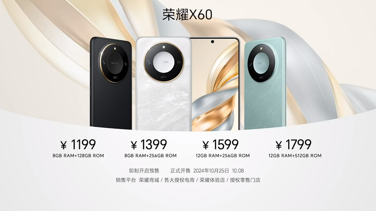 目前,荣耀X60 Pro和荣耀X60都已于10月16日开启预售,并将在10月25日10:08在荣耀商城、各大授权电商、荣耀体验店及授权门店正式开售。
