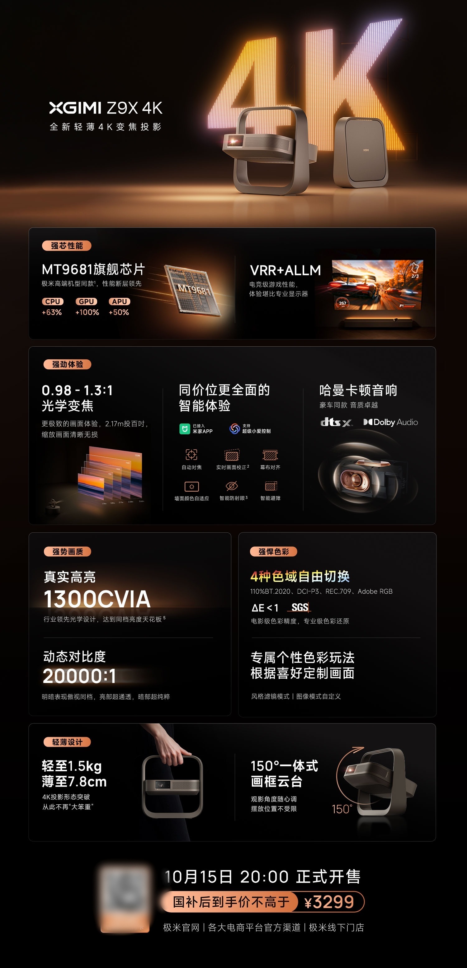 当4K投影仍被束缚在体积大、摆放难、不易挪动等常规认知时,极米 Z9X 4K以强者姿态轻装上阵,目前全平台已开启超前预约,国补后到手价不超过3299元。10月15日晚上8点,极米 Z9X 4K将在极米官网及小程序、线下门店、各大电商平台正式现货开售,叠加双十一大促福利政策还有更多惊喜释放。