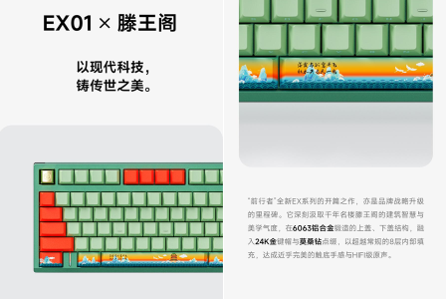 EX01滕王阁联名款则萃取千年建筑美学,用6063铝合金机身搭配24K金键帽与天然真钻,以满配填充达成极致手感与HIFI原声,成为收藏级科技艺术品。以“科技与人文共生”为主题,将滕王阁的古典建筑美学与产品科技感深度融合。通过高端配色定制技术,呈现键盘与古风元素的动态交互,强化品牌“国风科技”定位。