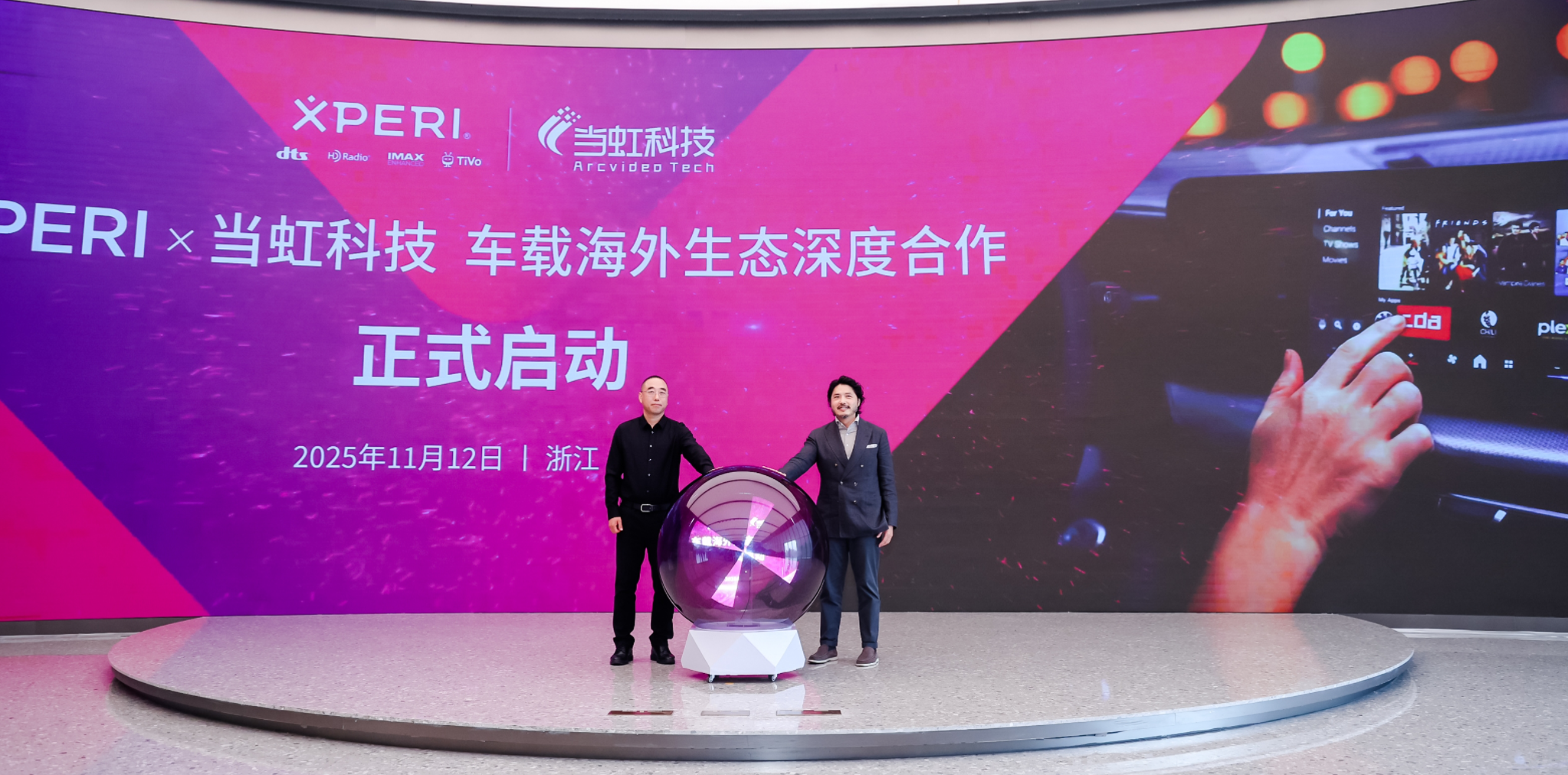 杭州,2025年11月12日——在今日举行的“Xperi体验日暨Xperi & 当虹科技车载海外生态深度合作发布会”上,全球音视频技术创新先锋Xperi集团向与会媒体、嘉宾等,推介展示了覆盖智能座舱、家庭影音、移动终端的全场景音视频解决方案,并现场宣布与杭州当虹科技股份有限公司达成车载海外生态战略合作,标志着中国智能汽车出海技术生态迎来里程碑式升级。
