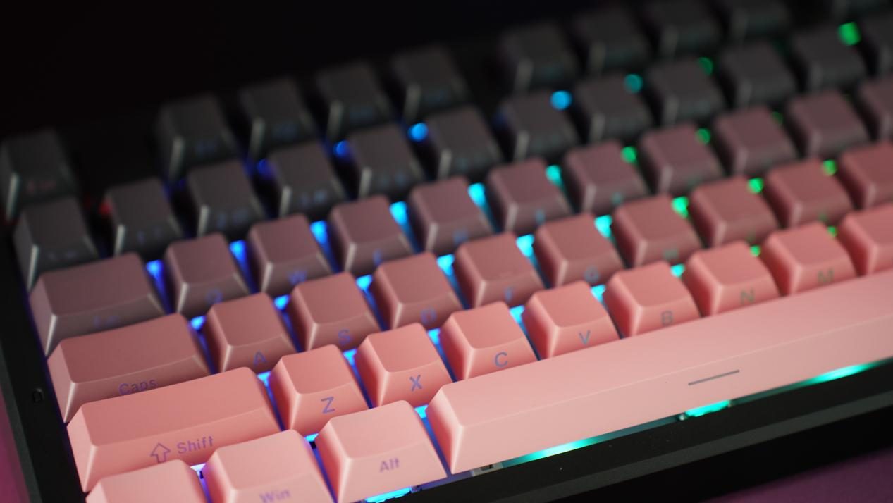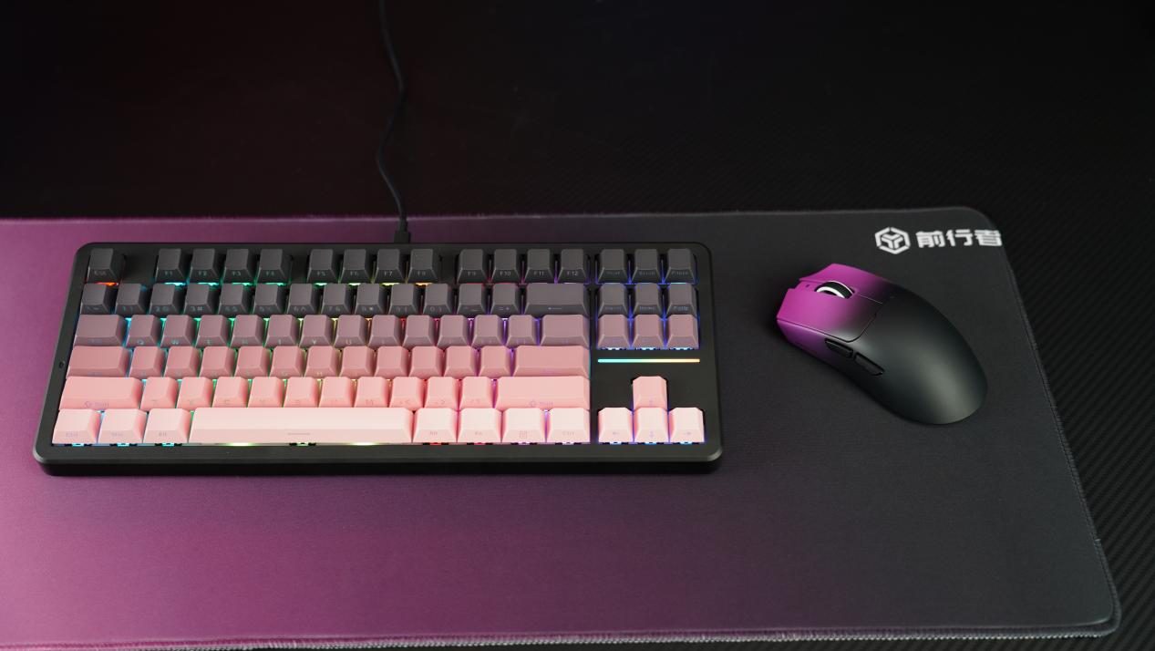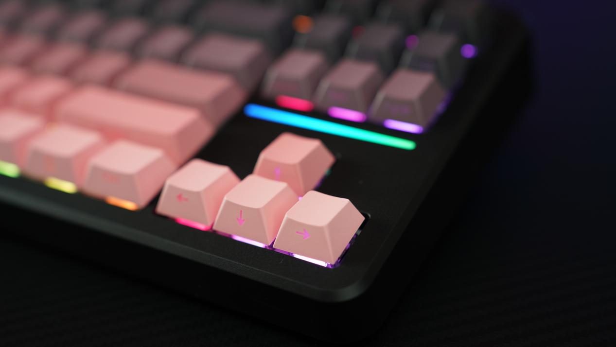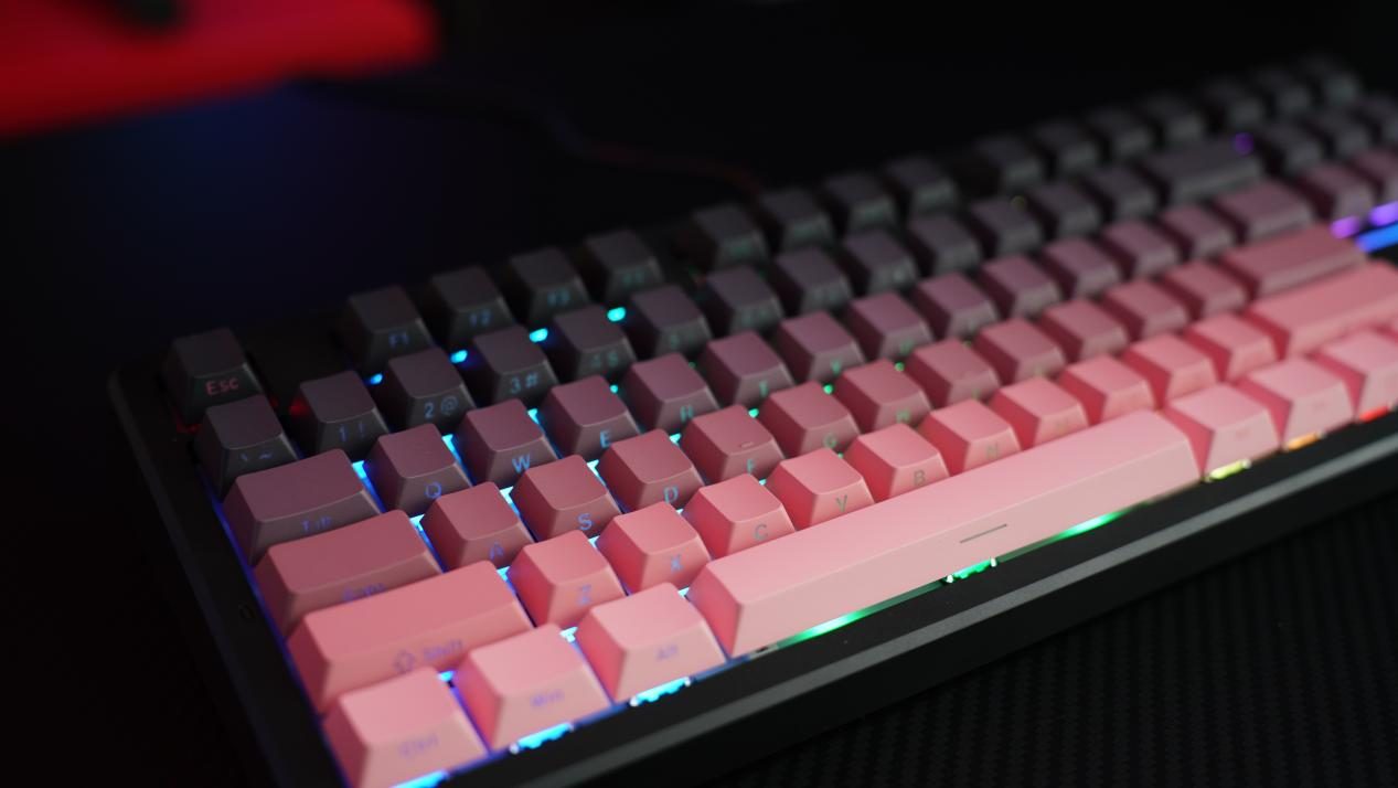 笔者手里这款X87ultra是经典黑莓粉配色,采用渐变PBT键帽+侧刻工艺,键帽表面感细腻且不易打油;