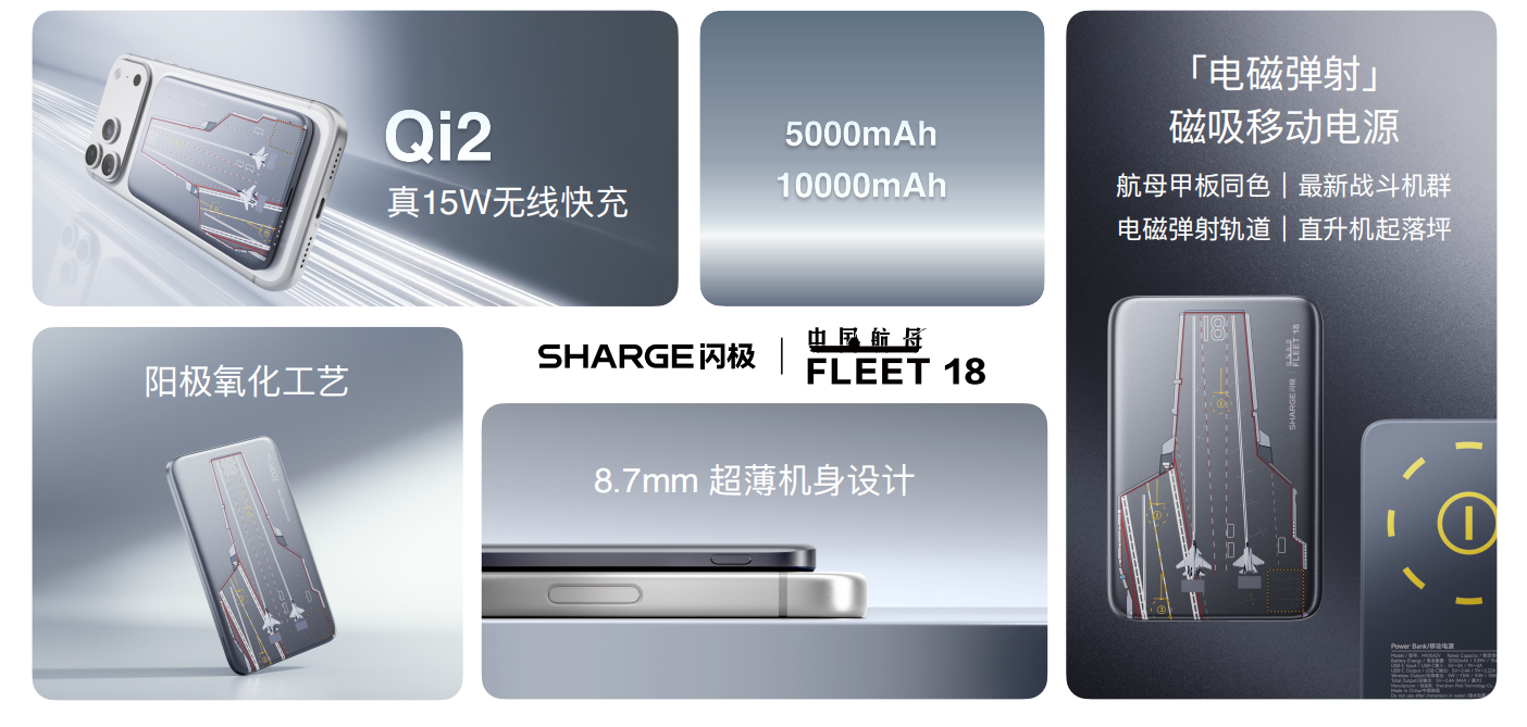 作为此次发布会的核心亮点,闪极中国航母联名系列将航母的硬核设计语言与闪极的极致产品理念深度融合,打造出兼具情感价值与实用性能的标杆产品。首发的「电磁弹射」磁吸移动电源,精准还原航母甲板、舰载机群、电磁弹射轨道等细节,让用户在日常使用中便能触摸到大国重器的磅礴气场。
