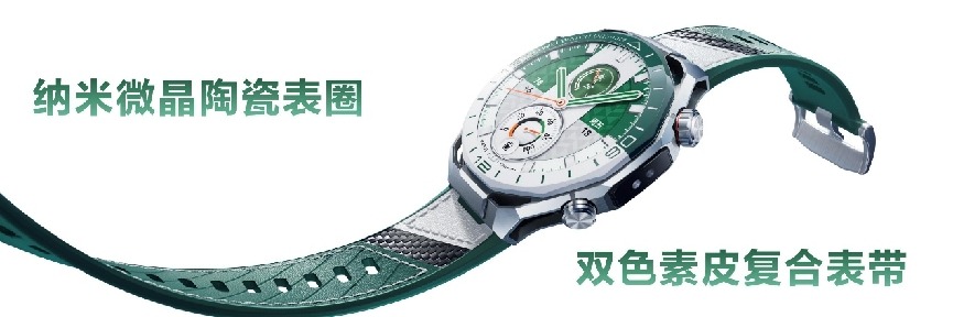 HUAWEI WATCH Ultimate 2非凡探索全新旷野绿配色,灵感源自球场绿茵与澄澈晴空。其标志性的绿白双色纳米微晶陶瓷表圈历经数十道工序,凝聚了华为在材料科学与制造工艺的深厚沉淀。