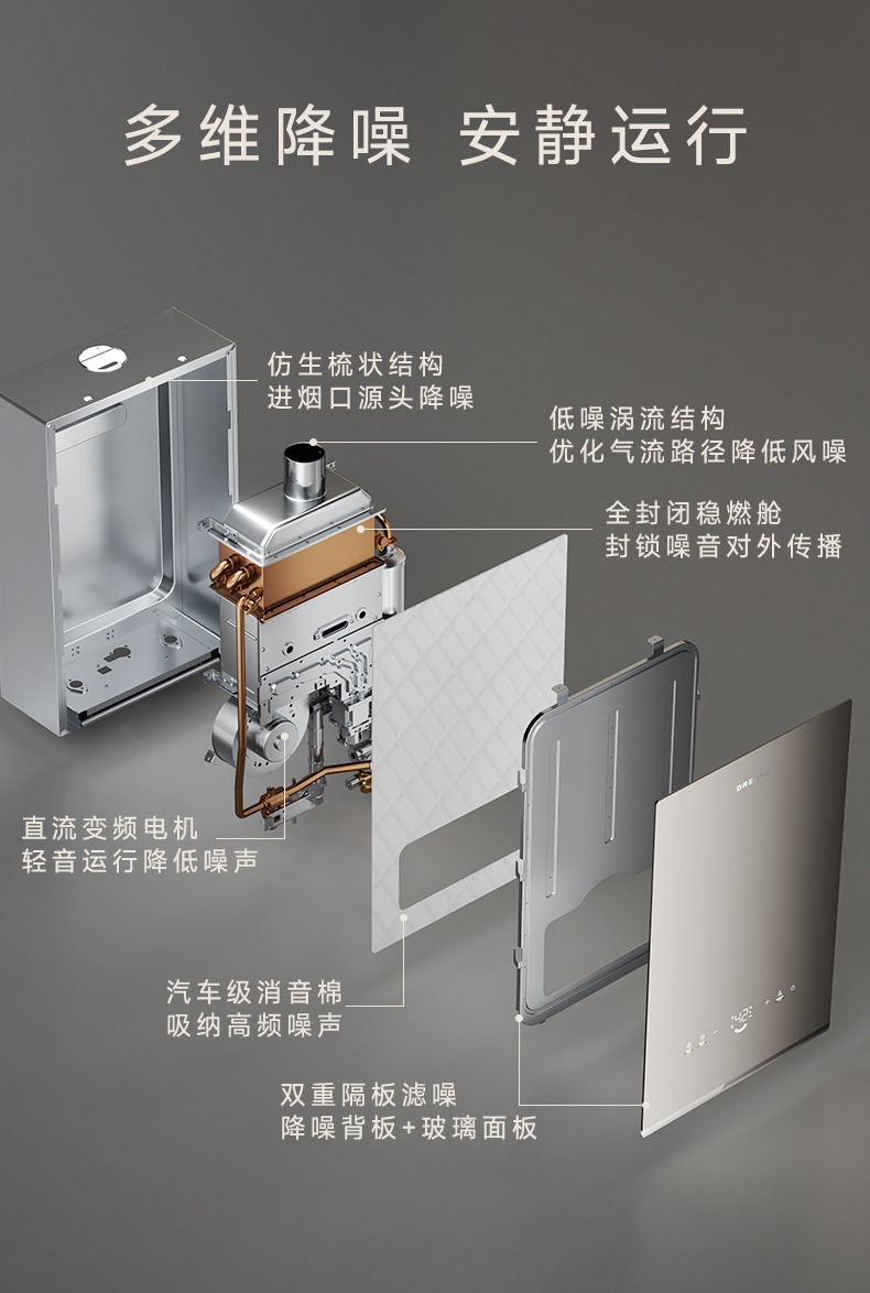 图书馆级静音<45dB:创新引入“夜枭静音系统”,从进风口的仿生梳状结构降噪,到全封闭稳燃舱的物理隔音,再到汽车级吸音棉的全面覆盖,让热水器在满负荷运行时的运作声音低至45分贝以下,营造静谧的居家环境。