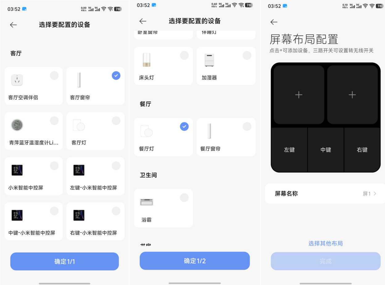 小米智能中控屏的核心价值在于其全屋设备联动能力。目前,我家已经接入了3路直连灯光(客厅主灯、餐厅灯、卧室灯),无需额外接开关,直接在中控屏上即可控制。此外,还可以控制窗帘、空调和电视等设备。操作逻辑简单直观,用户可以根据房间分类轻松找到并控制所需设备。