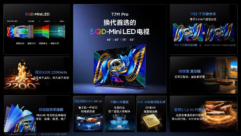 而 T7M Ultra 则作为六大维度技术进阶的全能选手,成为客厅的第一台 SQD-Mini LED 电视优选。2176 个万象分区、3000nits 峰值亮度,承袭 SQD-Mini LED 的核心技术基因,兼顾极致画质与流畅体验,是无短板的影游搭子,为追求高品质体验的消费者提供了全新选择。