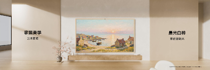 为了让电视更好地融入家居风格,华为Vision智慧屏 6推出了艺术画框可选配件,提供清新典雅的“晨光白桦”、中古风情的“烟色胡桃”两款配色供用户选择,通过卡扣式便捷安装,即可让电视秒变艺术名画。从莫奈的《睡莲》到阿尔卑斯的雪山,世界名画与自然景观在屏幕流转,墙面瞬间化身私人艺术展廊。