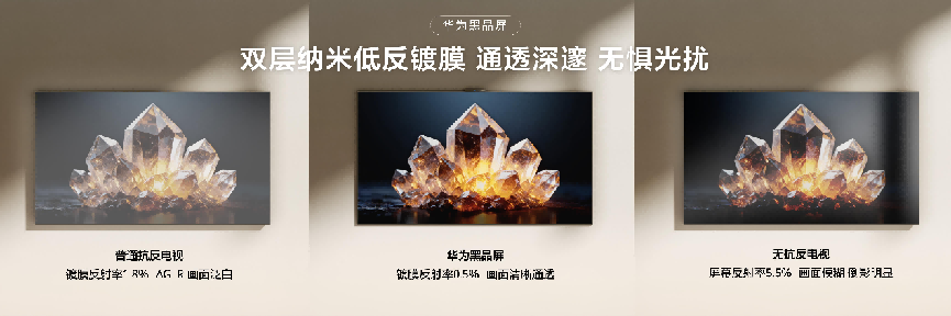 华为Vision智慧屏 6画质硬件全新升级,搭载全新华为黑晶屏。其采用双层纳米低反射镀膜,一层减少表面镜面反射,一层抵消内部散射光,膜片本身反射率低至0.5%,抑制环境光干扰。无论在阳光明媚的午后,还是光源不足的夜光环境,屏幕依然能保持深邃观感,沉浸式观影体验始终如一。透光性能方面,第六代液晶屏使透光率相比上一代大幅提升20%,搭配精细控光技术,让画面明暗对比更富张力。