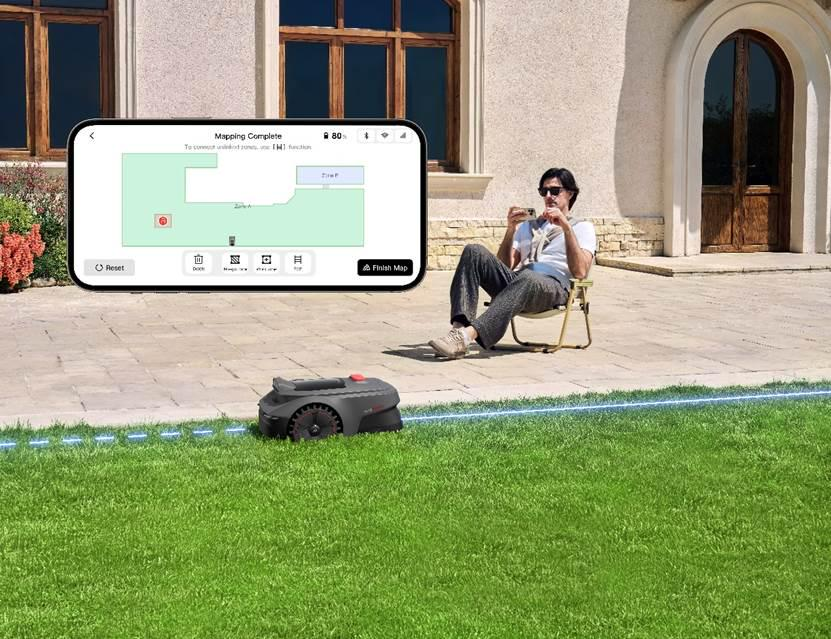 传统割草机依赖埋设边界线或依赖RTK基站定位,安装复杂且难以适应地形变化。MOVA自研的UltraEyes技术则采用了无人驾驶领域的视觉同步定位与建图(Visual SLAM)技术,仅需5分钟即可完成300㎡庭院的高精度地图构建。用户无需任何施工布线,只需通过MOVAhome App一键启动,割草机器人即可自主完成环境扫描与路径规划,真正实现“开箱即用”。