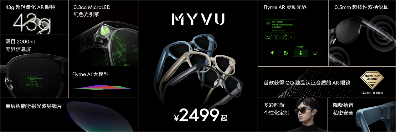 发布会上,星纪魅族集团正式发布 AR 智能眼镜品牌 MYVU,并推出 MYVU 探索版、MYVU 两款全天候时尚 AR 智能眼镜新品。即日起,MYVU 探索版将在魅族商城开启 9999 元全款预售,并在全网招募 520 名 AR 头号玩家参与 MYVU 探索版体验共创,用户可前往魅族社区参与活动报名;MYVU 售价 2499 元,有 6 期免息优惠,并将于 12 月 5 日 10 点在线上线下全渠道开售。